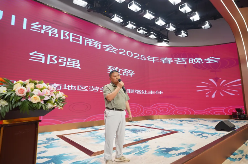 惠州市四川绵阳商会会长、广东万宜源控股集团董事长黄小辉先生率先登台致辞。他详细回顾了商会自 2024 年 7 月成立以来的成长历程,在短短时间内克服重重困难,逐步发展壮大,取得了令人瞩目的成绩。同时,黄会长对未来商会的发展方向进行了清晰规划,展现出卓越的领导风采与前瞻性眼光。